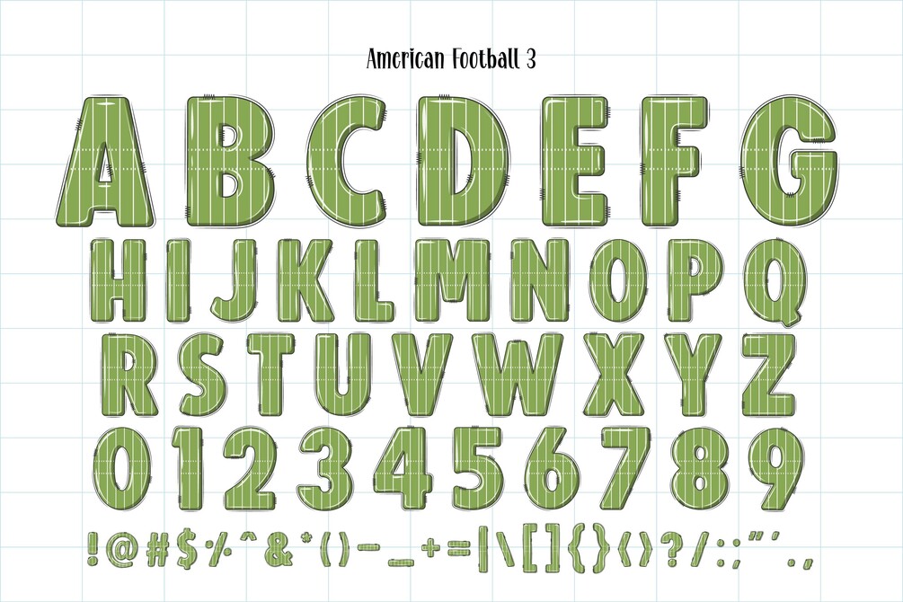 Elevate your game day crafts and projects with our American Football Doodle Alphabet! Whether you're creating personalized sports-themed invitations, banners, or scrapbook pages, this hand-drawn font is perfect for capturing the spirit of American football.